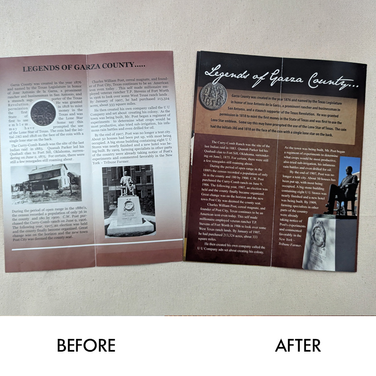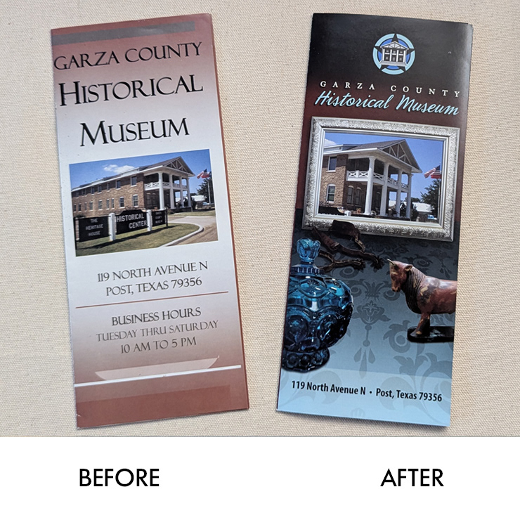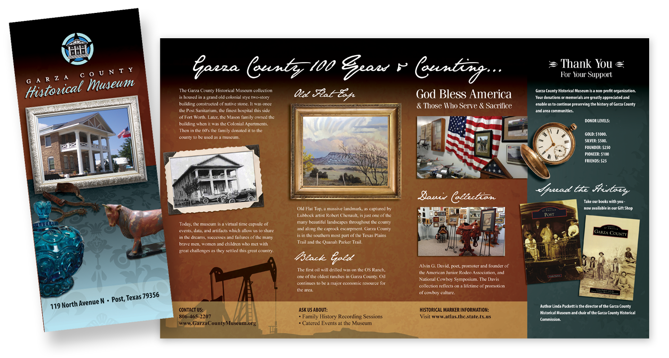 I was excited for the opportunity to upgrade the brochure for the Garza County Historical Museum. The only direction was to keep the same size and folding format as the previous version; otherwise, I was given carte blanche. I also took the liberty of creating a logo for the organization since they didn’t have one. I explored the museum and photographed artifacts I could feature in creative ways. I selected fonts and colors that conveyed a sense of nostalgia and history, and had the brochures printed at a reasonable cost for the non-profit organization. The finished product elevated the museum’s image and increased attention from the community.